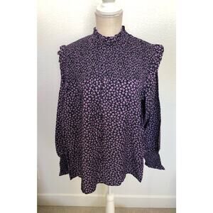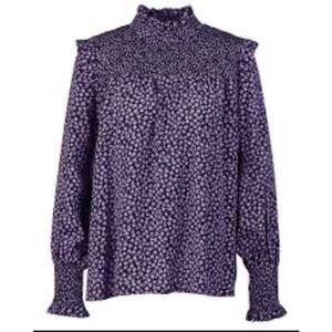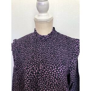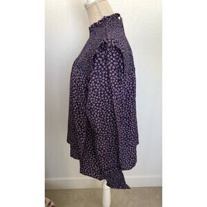 This floral top is stylish and easy to dress up or down. It features a beautiful floral print that comes in a black and purple pattern. The neckline is a mock turtleneck and features shirring that gives comfort to the design. The cuffs are also shirred at the wrist. There is delicate ruffling at the shoulders that adds style. New with tags.
