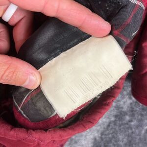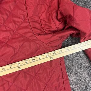 Barbour Quilted Blanket Lined Jacket Red Sz L Corduroy Collar Button Front. **There is a very tiny pinhole on front of jacket; some wear on the buttons and some stitching flaws on quilted areas as shown in photos. No other flaws noted. Please refer to all photos for condition and sizing.