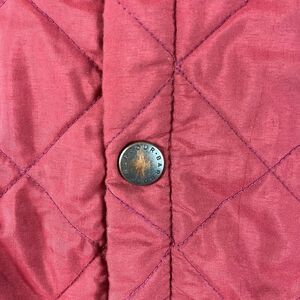 Barbour Quilted Blanket Lined Jacket Red Sz L Corduroy Collar Button Front. **There is a very tiny pinhole on front of jacket; some wear on the buttons and some stitching flaws on quilted areas as shown in photos. No other flaws noted. Please refer to all photos for condition and sizing.