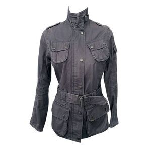 Barbour L2051 Washed Twill Jacket from the International Collection. Dark navy blue/gray color. Utility look and feel. Multiple pockets with snaps. Belted waist, zip and snap front with optional high collar. Patch on front left pocket has been removed. Approximately 26.5” long and 18” armpit to armpit, zipped. Retail $400