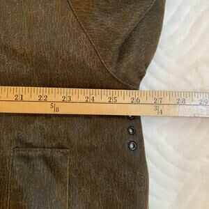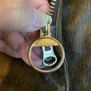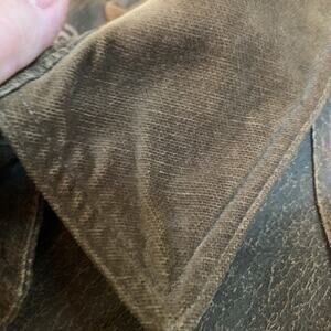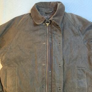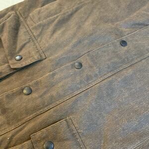 The Barbour Bushman Wax Jacket in size Large is a classic country chore utility coat perfect for chores, riding and other occasions. Made with durable cotton waxed water proof outer shell and lined with cotton, this mid-length jacket features a full zip closure with logo accents. The jacket's vintage style with patina and waxed finish adds a timeless charm, while the multiple pockets provide practicality for outdoor activities like walking, hunting, and hiking. Made in the United Kingdom by the renowned brand Barbour, this brown jacket is a versatile and stylish addition to any man's wardrobe for the fall and winter.