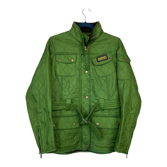 "Updating the iconic Barbour International look with a cosy Polarquilt combination, this slim-fitting design features a diamond-quilted outer and a fleece lining for luxurious warmth with a soft feel. Four studded pockets, a funnel collar with neck strap, a sleeve pocket and shoulder patches retain the authentic biker-jacket look, while a buckle-close belt creates a flattering silhouette."