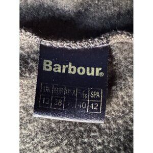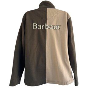 Barbour woman's two-toned sweatshirt jacket. Jacket is done in brown and light tan. I will say inside it looks olive green to me, but the pictures show it is brown. It has a full zip front, two side pockets, and "Barbour" embroidered on the front and back. Jacket feels like a sweatshirt and is fleece-lined. It's made of a cotton poly blend and is a woman's US size 8. Hard to see but it is a size 8.