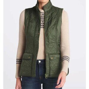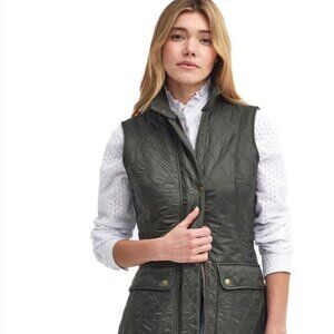 The Barbour Wray Gilet is a feminine design created with a diamond-quilted outer featuring curved side hems and a dropped back hem. It fastens through the centre front to a funnel collar, and is lined in fleece for an extra-cosy feel. This easy-wearing gilet is finished with tonal Barbour embroidery to the left pocket flap.