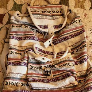 Multi-colored drawstring knapsack. One buckle closure outside pocket. Gently used. In very good shape.
