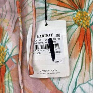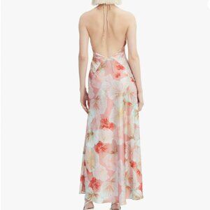 Bardot Aradia gown, Bardot dress, halter maxi dress, floral halter gown, rosette detail, peach floral, plunge neckline, open back, leg slit, wedding guest dress, beach wedding, formal floral, resort wear, summer occasion dress, feminine maxi, flowy gown, bias cut, satin finish, Bardot Australia, Anthropologie Bardot, evening dress, NWT.