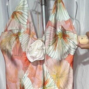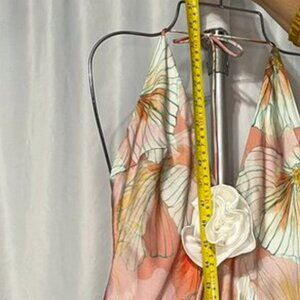 Style Aradia Rosette Floral Plunge Halter Gown. A soft peach floral maxi with a deep plunging halter neckline, airy open back, and a romantic rosette accent at the bust. Features a leg-baring side slit and fluid drape that moves beautifully. Hidden side zip; ties at neck. Fully lined. MSRP $159.
