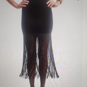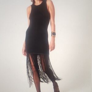 Chic black midi dress with fringe hem. Sleeveless design. Perfect for evening wear.