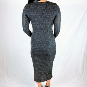 Black and gold ribbed sweater dress, lace up bust, midi length.