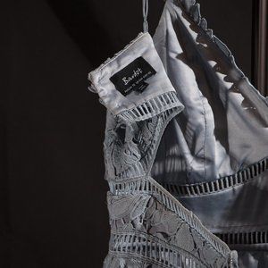 Self & Trim: 100% poly.Lining: 95% poly, 5% elastane. Hand wash cold. Fully lined. Adjustable shoulder straps. Allover lace fabric. Back cut-out with button closures. Hidden back zipper closure.