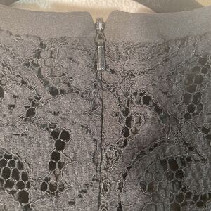 FEATURES/ACCENTS: Black Lace, fitted, lined bodice, sheer sleeve and past knee, deep plunge lace up front, zip back closure