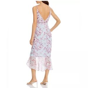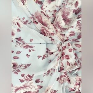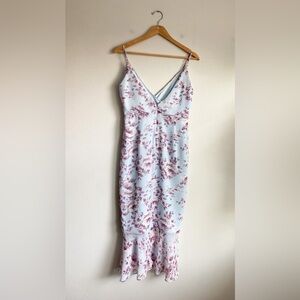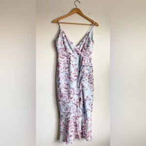 Bardot Floral Mermaid Midi Dress Faux Wrap Blue Burgundy Wedding Guest Fairy M