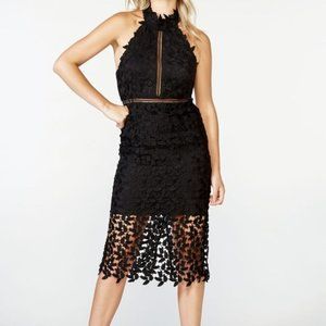 - Embroidered lace overlay, buttons at back neck, open back with straps