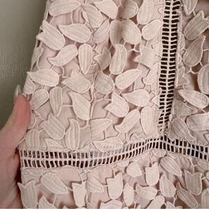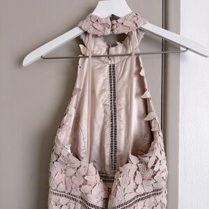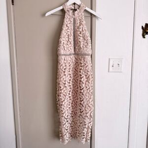 Bardot dress in soft pink. Features delicate lace overlay with halter neckline