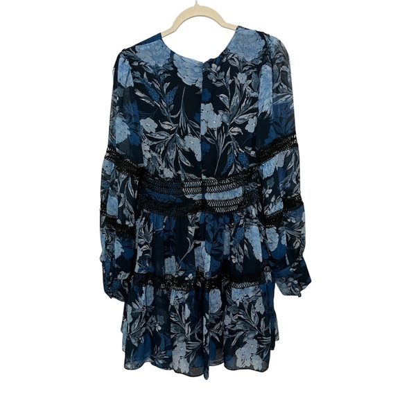 Chic Bardot dress with floral pattern. Features long sleeves and a deep V-neck. Perfect for stylish outings.  Gently used.  Large.