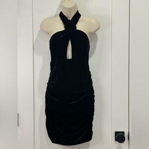 Bardot Inara Velour Mini Dress Rosette Halter Bodycon Ruched Black Size 8 New