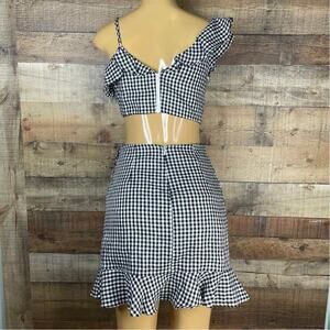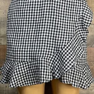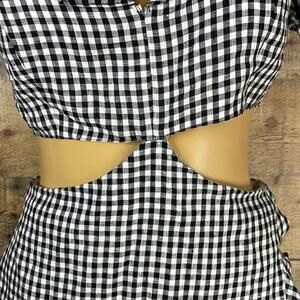Bardot Jamie Cut Out Dress. Style# 50045DBX. Size 6/Small. Color ~ Black white gingham. Lined. Adjustable shoulder strap. Ruffle trim. Waist cut-out. Back zipper closure. Excellent condition. Measurements are in the pictures.