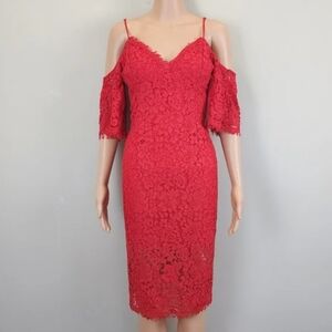 Turn heads with this stunning red lace dress. The off-shoulder design adds a touch of elegance, perfect for any special occasion.Partially lined