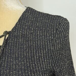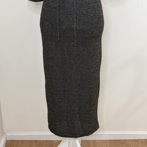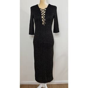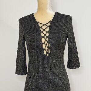 Bardot Lace Up Ribbed Sheath Midi Dress Size 6 Black Gold Half Sleeve Stretch