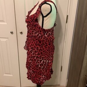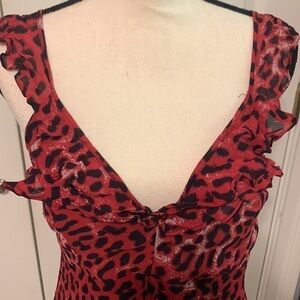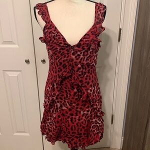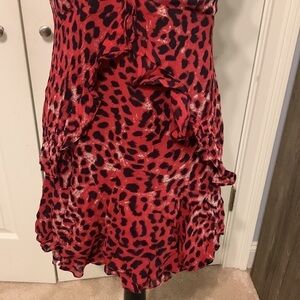 NWT Sexy dress! V neckline with ruffle detail. Empire waist and fluted skirt with ruffle detail. Open back with adjustable tie straps. Fully lined with heavy lining in the bust area. Back zip closure. Viscose Size 10 Color Red Leopard 18” PTP & 32” L