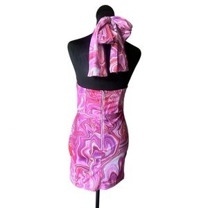 Bardot brings the drama with this pink marble mesh halter mini dress in bold swirl print. Features a crisscross halterneck tie closure, boned bodice, and sheer mesh overlay with allover ruching. Exposed back zipper and open back add extra edge.