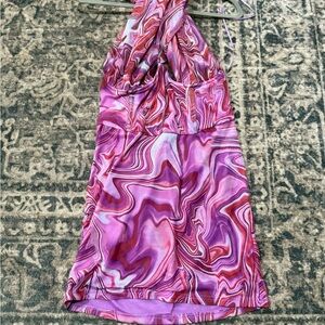 Stylish mini dress with a vibrant pink swirl pattern. Perfect for a night out.