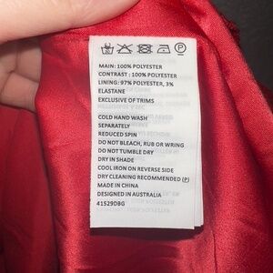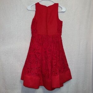 Elegant red lace dress. Features a large bow. Perfect for formal occasions.