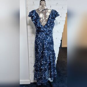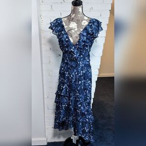 Excellent condition. Tiers of ruffles hang at beautifully asymmetrical lengths on this light and airy dress in a dense floral print. Does not include belt