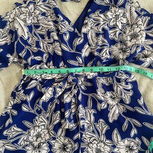 Perfect billowy spring/summer romper with a v-neckline. Cinches comfortably in the waist with a tie. Stretchy waist band.