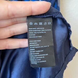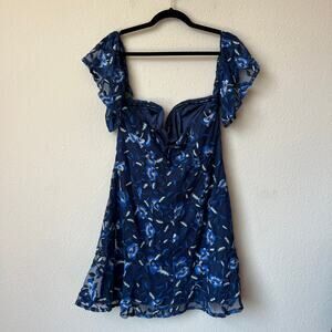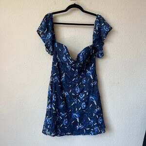 Bardot navy blue dress featuring floral embroidery with silver accents on sheer mesh overlay. Off-the-shoulder sweetheart neckline with flutter sleeves and a fitted silhouette that flatters the figure. Fully lined. Size Large - 18.5" pit to pit; 17" waist; 24" length from pit.
