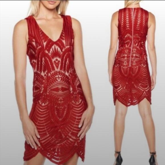 Bardot Sheath Mini Dress Womens 4 Red Lace Scalloped Cocktail Vampy Holiday Glam