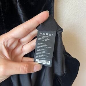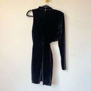 Bardot 'Stella' velour mini dress in black. A bold, statement-making piece perfect for nights out or special occasions. Designed in plush black velvet, features an asymmetric silhouette with one long sleeve, cut outs at bodice, and a mini length with a subtle slit for added edge. Mock neck with back zipper closure. Size Medium, fits US 6 - 17.5" pit to pit; 14" waist; 24" length from pit.