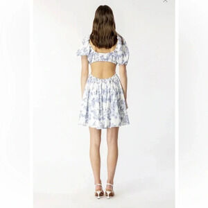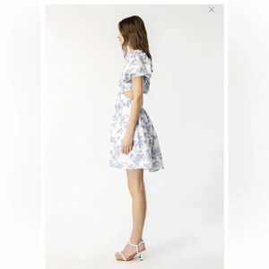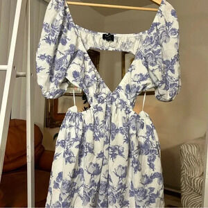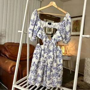 Chic mini dress with a floral pattern. Features a deep V-neck and puff sleeves. Perfect for a stylish look.