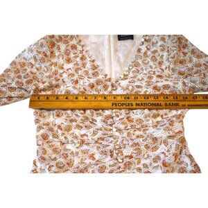 Bardot long sleeve mini dress featuring an allover tan and orange paisley print on white broderie/crochet lace with a fully lined body for coverage. The fitted ruched waist, fabric-covered buttons down the front, and slight front slit create a figure-flattering silhouette that falls around mid-thigh on most and works beautifully for brunch, date night, or parties.