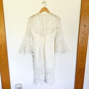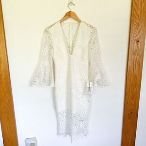 A semi-sheer extended lace hem and flared sleeves style a whimsical sheath dress designed with a fitted waist and plunging neckline.