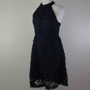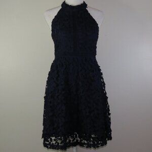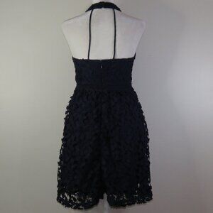 Bardot Junior Women's Navy-Blue Halter Formal Dress with Leaf Lace Overlay Size 16 (C1595)