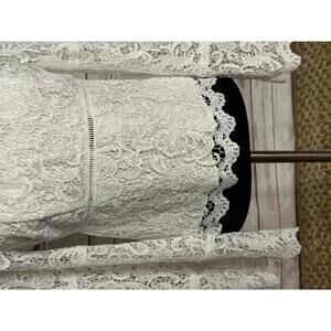 White floral lace; mock neck; long flared sleeves; back keyhole opening w/ double button closure; exposed back zipper; partly lined; scalloped hem
