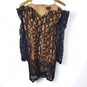 Bardot lace bodycon mini dress with off the shoulder long lace sleeves. Satin lined with back zipper.