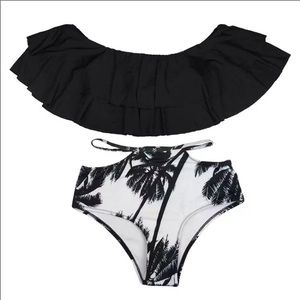 Bardot top high waisted bikini set , top white with green white palm leaf bottoms / top black with black and white leaf print