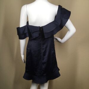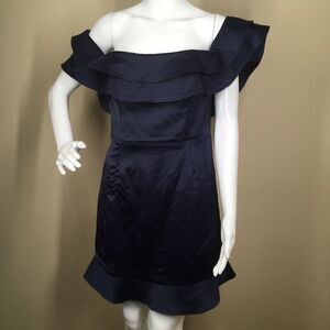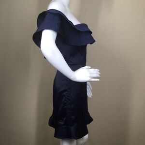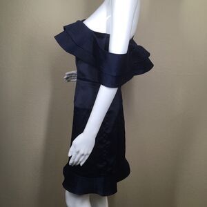 Frilly ruffles along the shoulder-baring neckline and hem add playful volume to a satiny, figure-skimming dress.