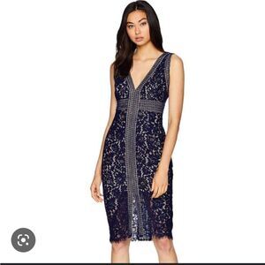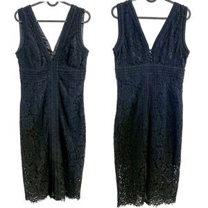 Features a sleeveless silhouette, V neck and V back, buttons up the back, hidden side zipper for easy on and off, full lace, lined, short midi length to the knee, black