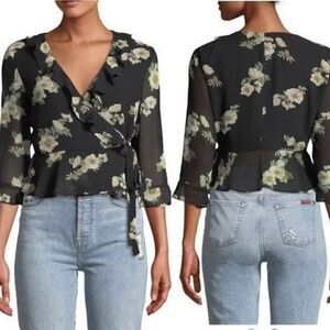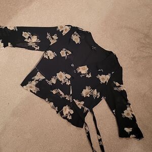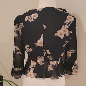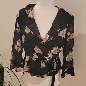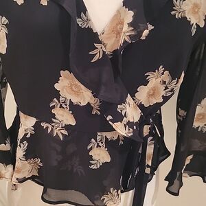 like new condition. wrap around style. 3/4 sleeves black with ivory flowers. ruffles around collar.