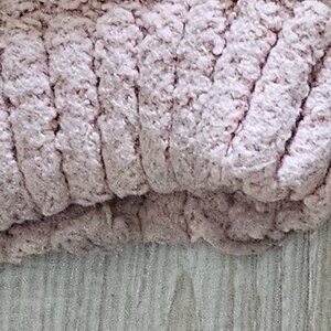 Comfy pants and long sleeve shirt in fuzzy material in a pink/peach color. Pants have jogger cuff and shirt if V-neck. There is some wear on the cuffs of the pants. See photo of cuffs. Size Medium.