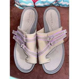 The Bare Trap women's slide sandal features a multicolor design and a slip-on closure for easy wear. It includes adjustable straps, a cushioned footbed, and a durable outsole, making it ideal for casual summer occasions. The sandal has a flat heel height, suitable for everyday comfort. This item is pre-owned.