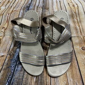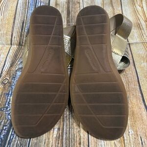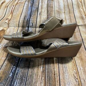 This is a pair of BareTraps Melody Leather Metallic Slip In Wedge Sandals Women’s Size 5.5. These sandals are still in excellent gently used condition. Please take a look at all photos for condition and if you have any questions please feel free to ask.