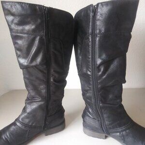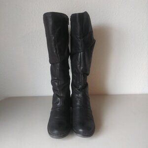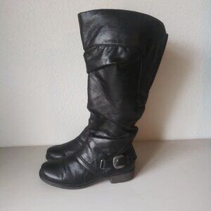 Bare Traps Sheridan black round toe, block heel, side zipper, buckle, back calf boot expander