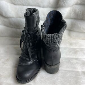 Bare traps black faux leather ankle boots side zipper black sweater back SZ9.5 block 2” heels rubber soles. Pre owned in good used condition normal wear see all pictures any questions please message.
