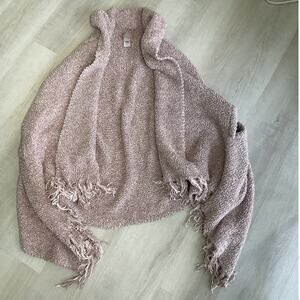 -Features: One Size, likely a relaxed and open-front style, fringe details along the edges its cozy and gentle aesthetic, the plush and knit construction suggest it provides warmth making it suitable for cooler weather or for lounging and comfortable wearing