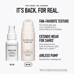 The Original Prime Time Primer is back, for real—24hr makeup extension and oil control.* This clean, mattifying formula smooths texture, blurs pores, and nourishes skin with antioxidant-rich vitamins C+E and mineral-rich sea water for a healthier-looking complexion.