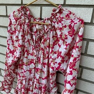 Crafted from the softest Rayon, the Lalani swing dress is brimming with romantic details. Gorgeous neckline with delicate frill detail and soft billowing sleeves and finished with statement elasticated cuff. Stunning tiered hem cascades to create bohemian silhouette. Size XS. Great used condition - this listing does not include original belt.